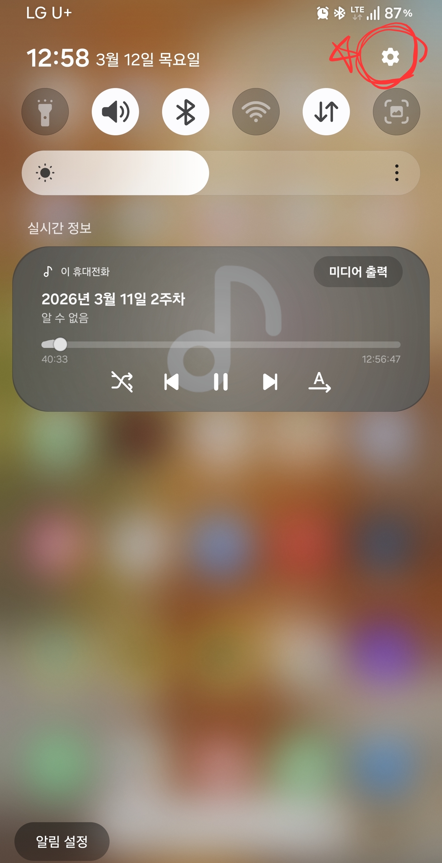 화면을 아래로 슬라이딩 해서 설정을 누르든