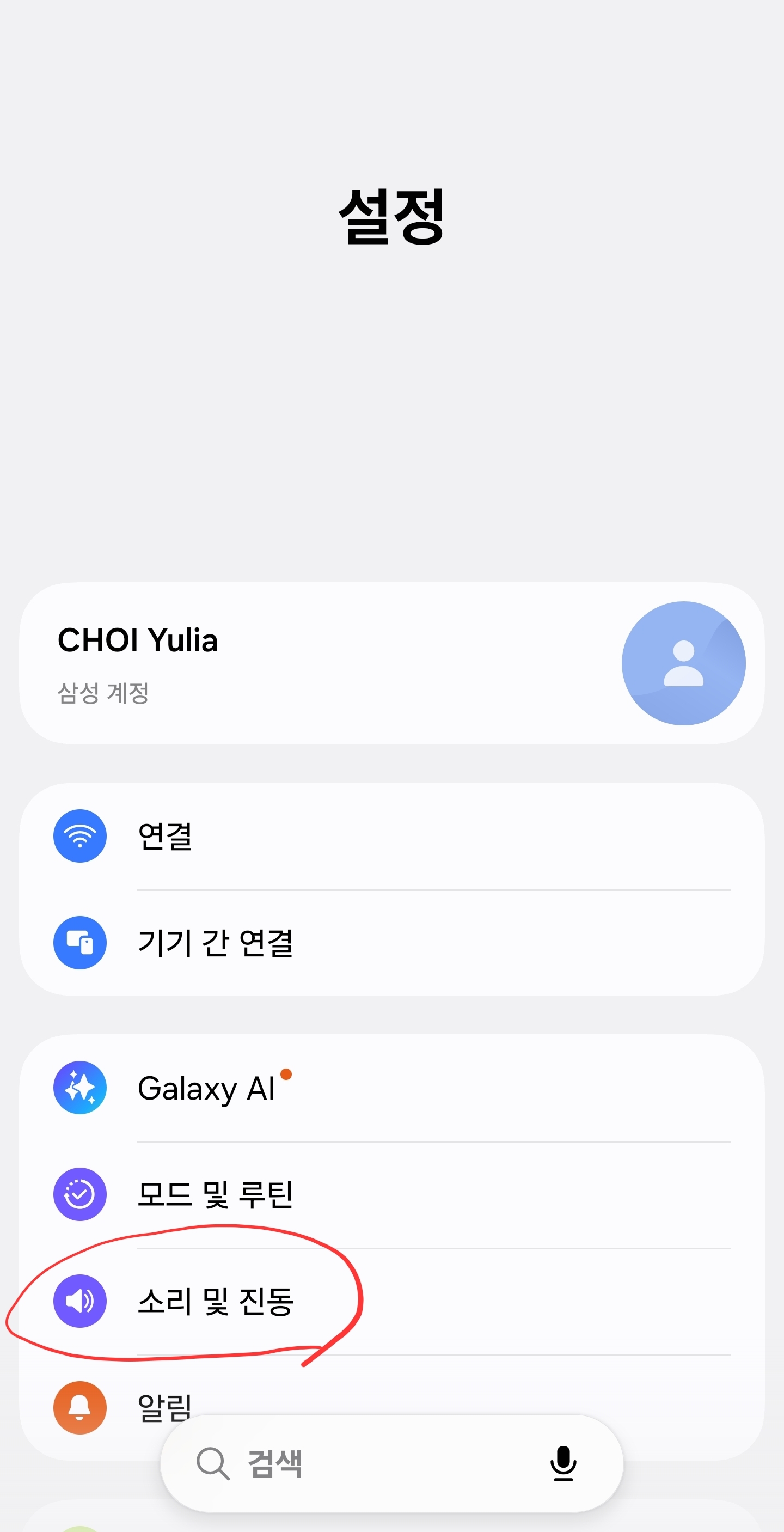 설정 에서 '소리 및 진동' 을 찾아서 누릅니다