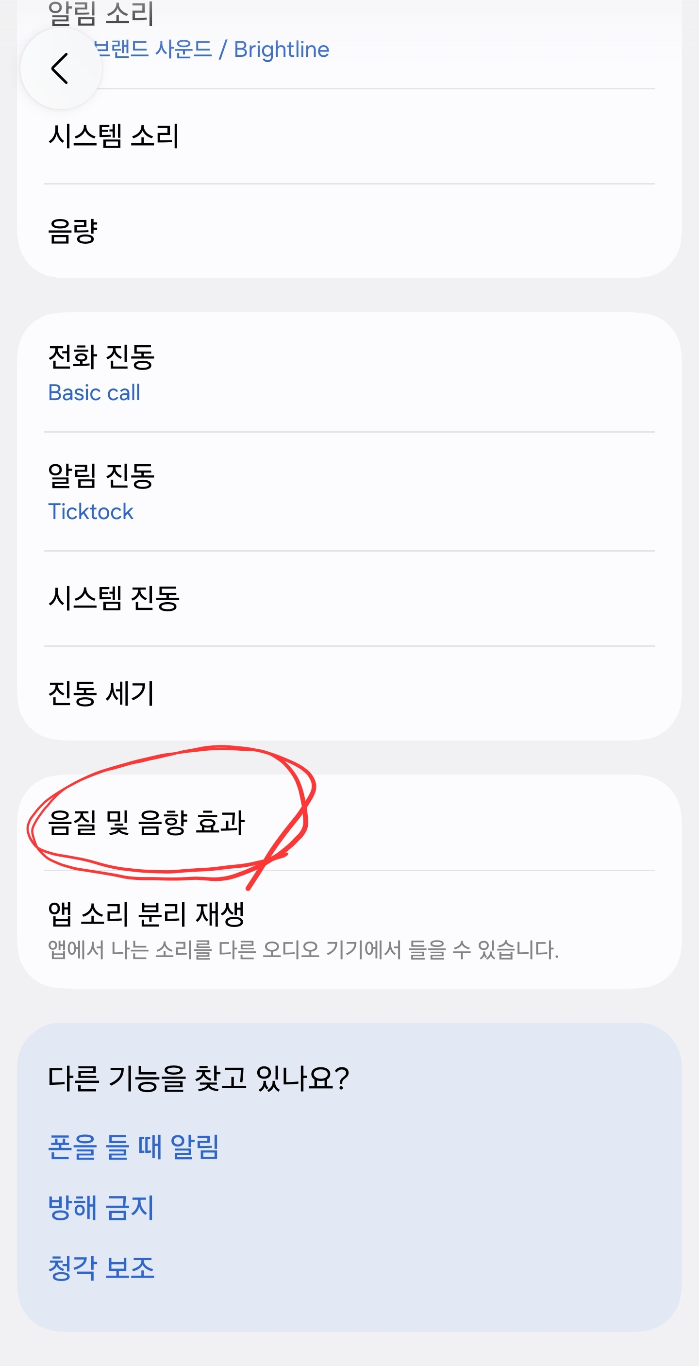 소리 및 진동 하위에 있는 '음질 및 음향 효과'를 누릅니다